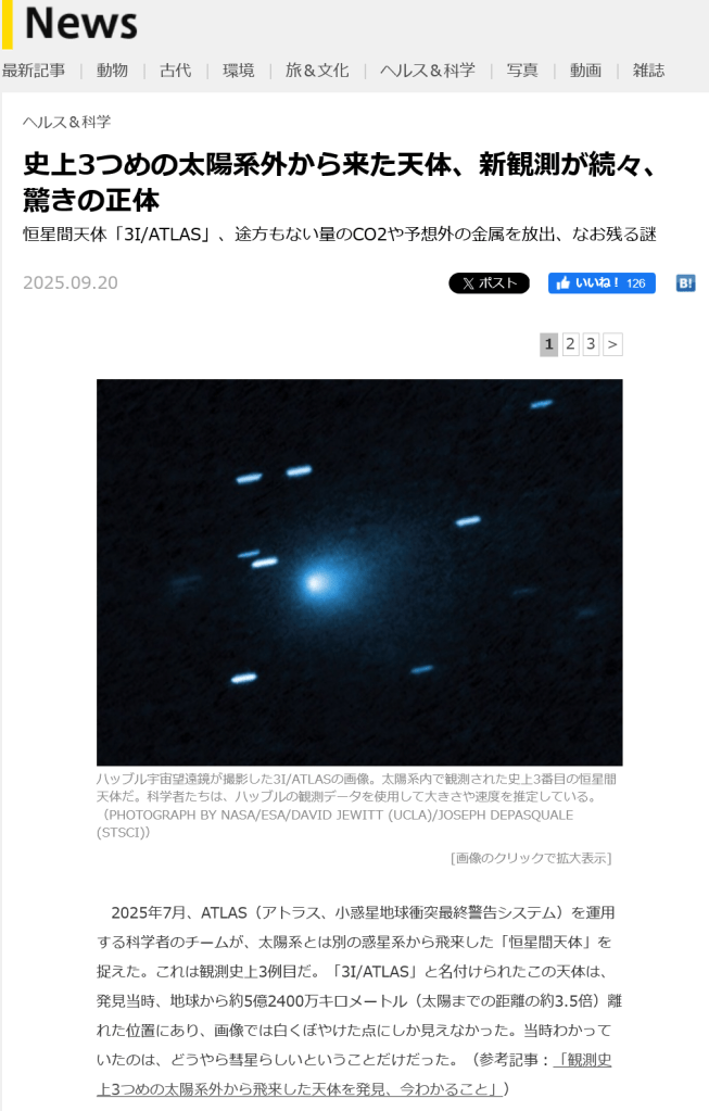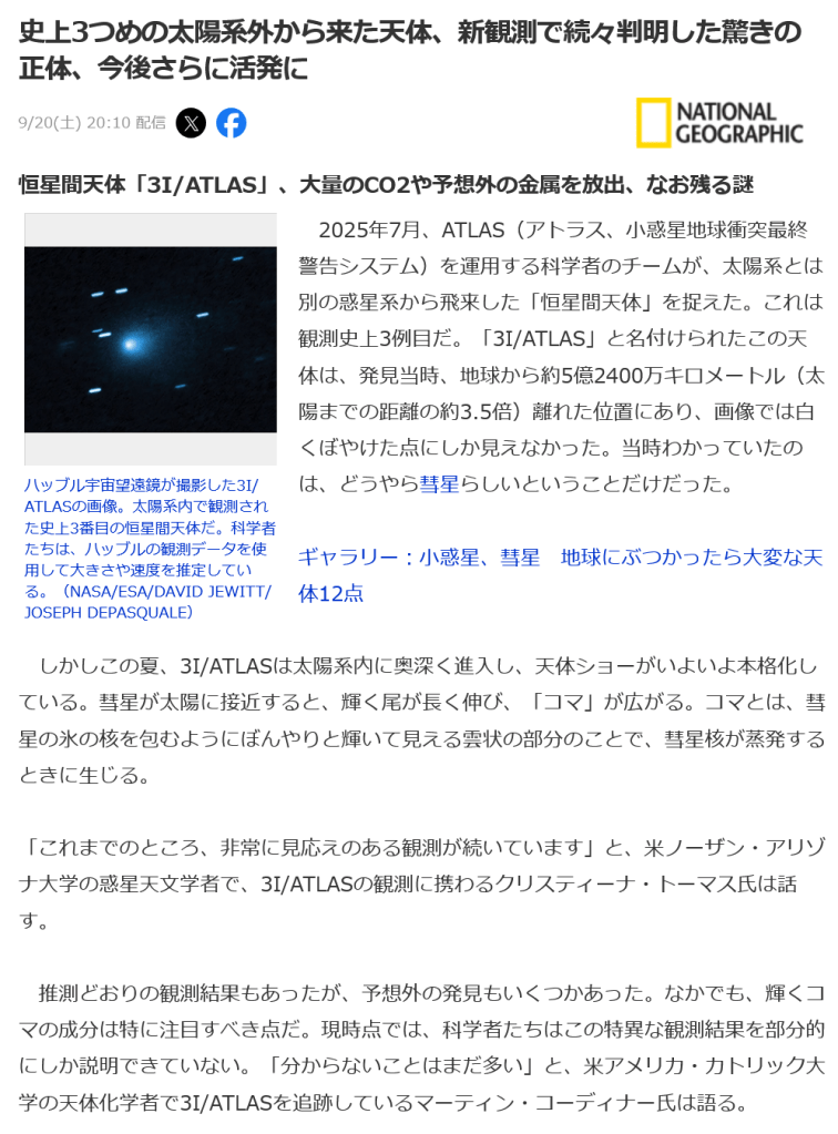 3I/ATLASについては色々な情報が噴出しているが、何れにせよ3I/ATLASの生物説及び地球外生命体の乗り物説等はNASAの情報によって完全に否定された。