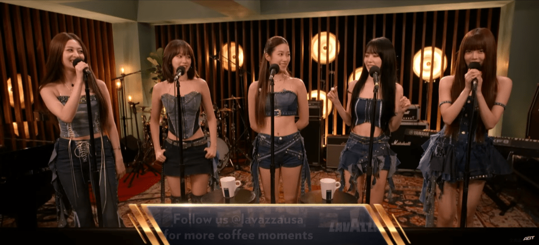 向かって視聴者から左端がユンジン、隣にチェウォン、中央がカズハ、並んで宮脇咲良、ウンチェ‥。実際に歌唱している動画を視れば一目瞭然だが、特に中央カズハから右側3人には表現したいものを体の中に持っていない。